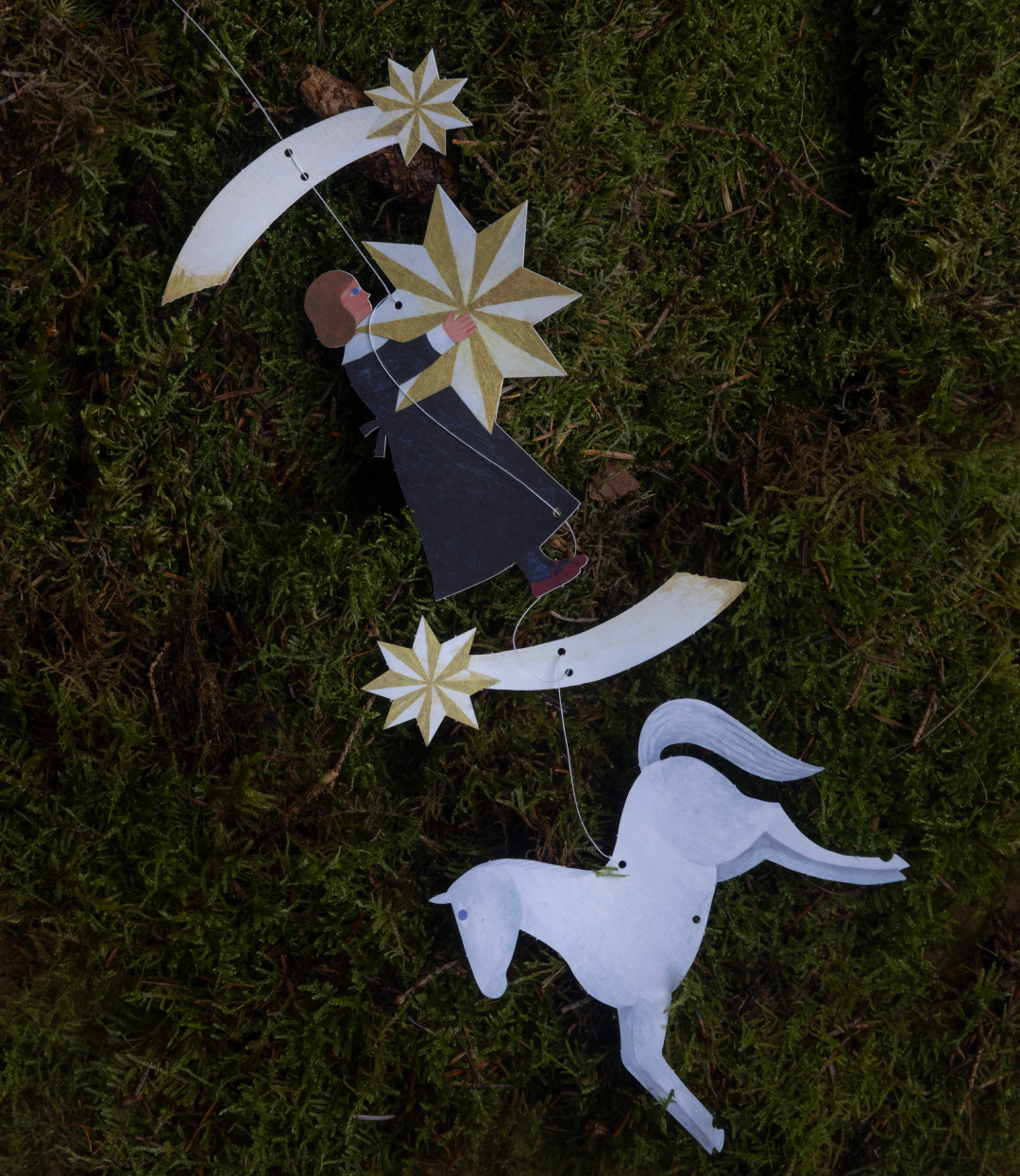 This card isn't just any card; it's a small kit in an envelope. Remove the pieces from the punched paper, thread the wire through the holes, and tie everything together to create a cheerful mobile.