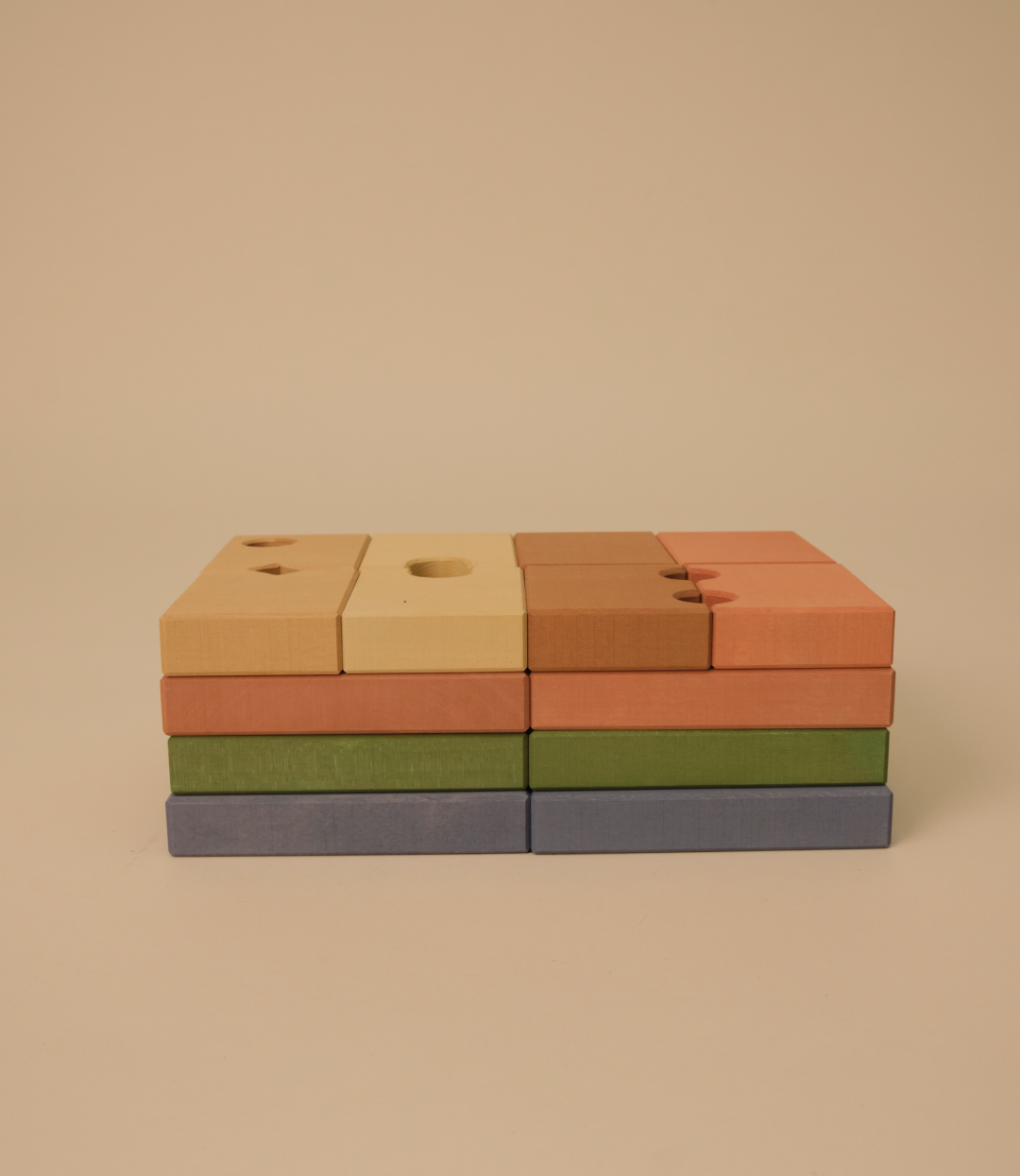 Met 29 stevige bouwstenen in heldere, rustige vormen, sommige met speelse uitsparingen, wordt je uitgenodigd om te bouwen zoals jij dat wilt. Een wolkenkrabber, een hele wijk… of iets dat alleen in jouw hoofd bestaat.