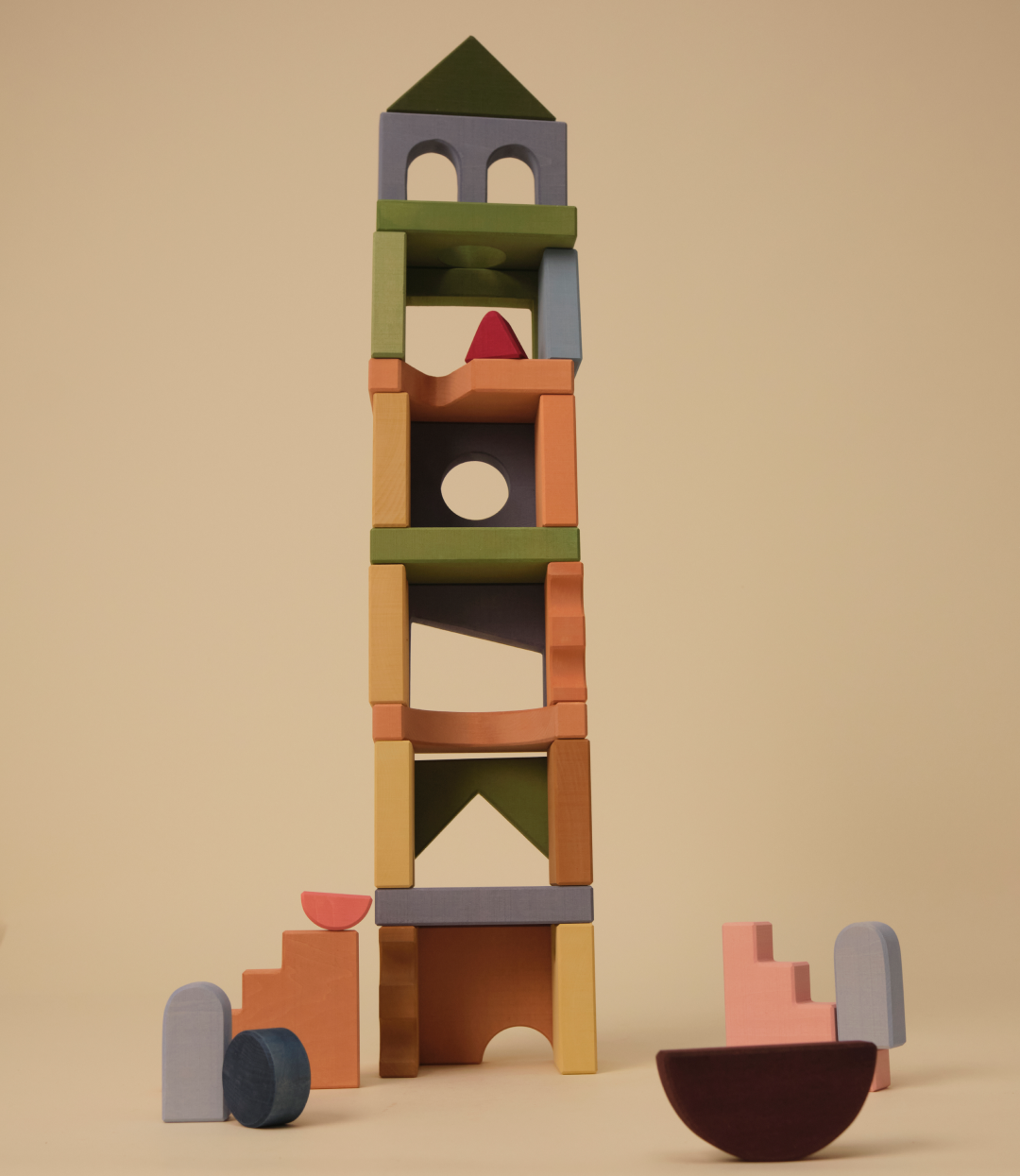 De doordachte vormen maken architectonisch spel bijna vanzelfsprekend. Kinderen ontdekken al bouwend hoe dingen werken: balans, ontwerp, ruimte, ritme.
