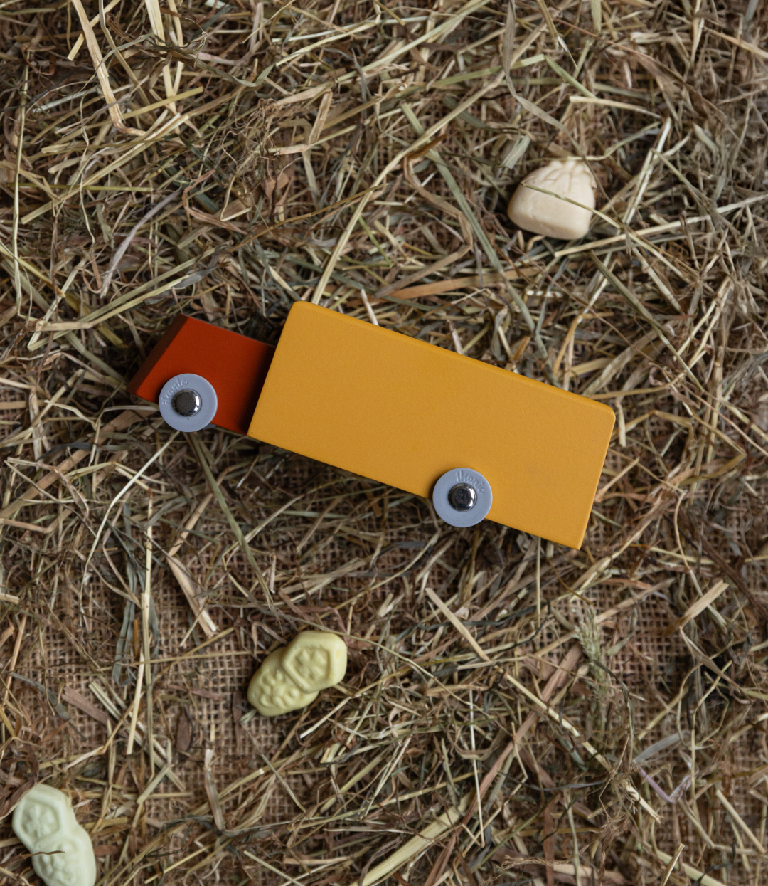 Deze geel en oranje houten vrachtauto, is de nr. 6 uit de Duotone Serie van ontwerper Floris Hovers. Een robuuste maar minimalistische verschijning, die spreekt met kleur. Ontworpen om mee te spelen of om naar te blijven kijken.