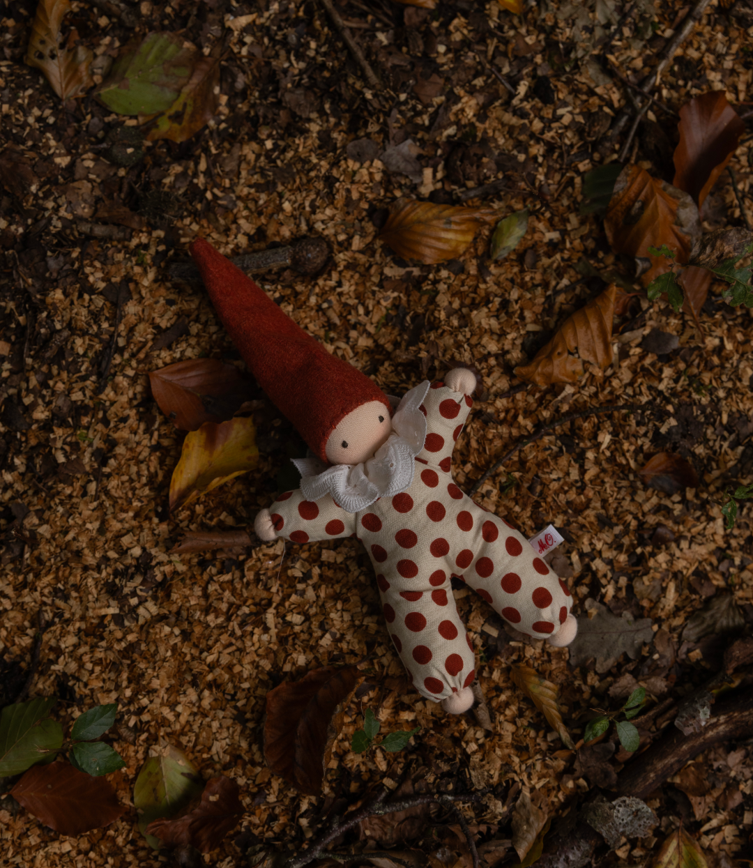 Een met de hand gemaakt poppetje van katoen, gevuld met zachte wol. Het draagt een fluwelen mutsje en een kraagje van vintage stofjes. Elk exemplaar is uniek en van ieder stofje is een kleine oplage. Een tijdloos popje, dat herinneringen gaat verzamelen.