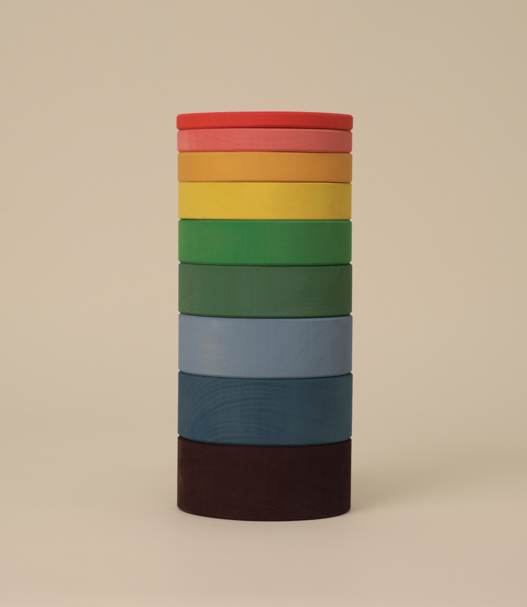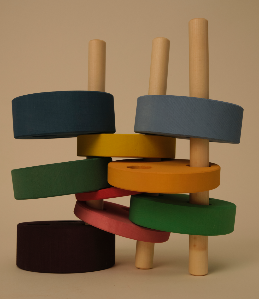 De ringen verschillen in dikte en kleur, waardoor het stapelen een spel blijft van balans, verbeelding en ontdekken.