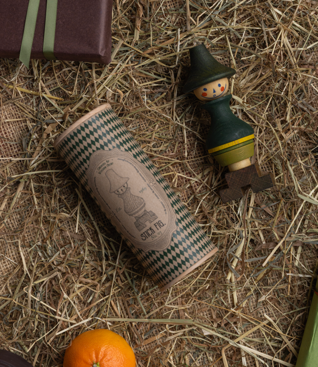 Verpakt als een cadeautje in een katoenen zakje en een kleurrijke kartonnen koker met een houten dop.